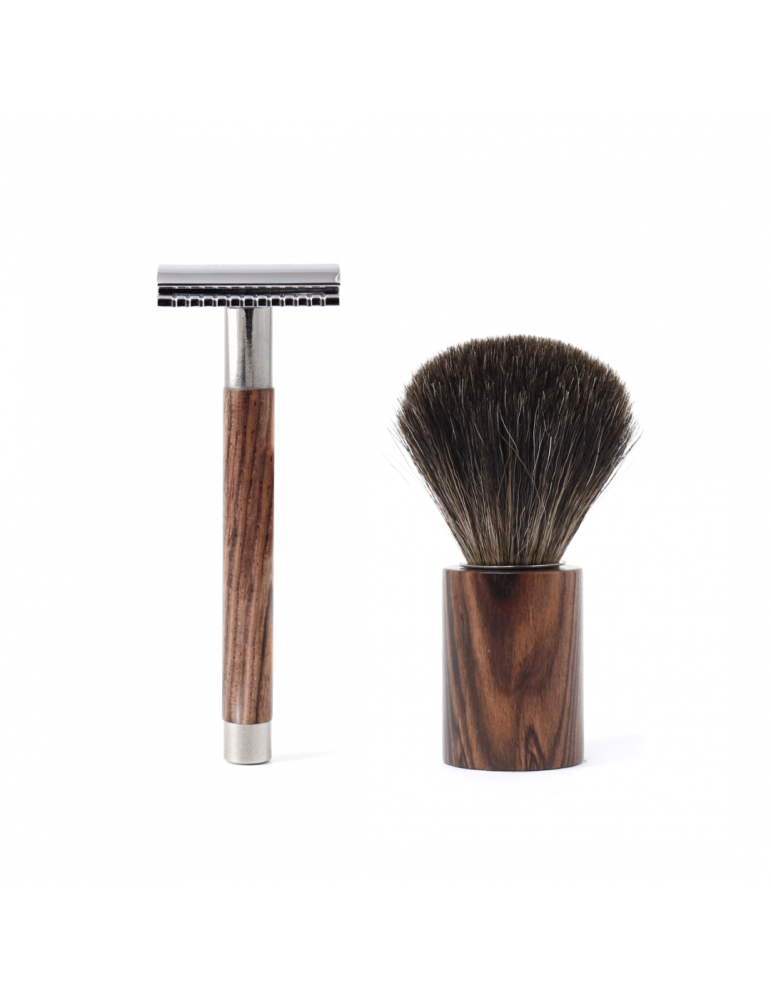 Cet ensemble de rasage contient un rasoir de sûreté et un blaireau de rasage.